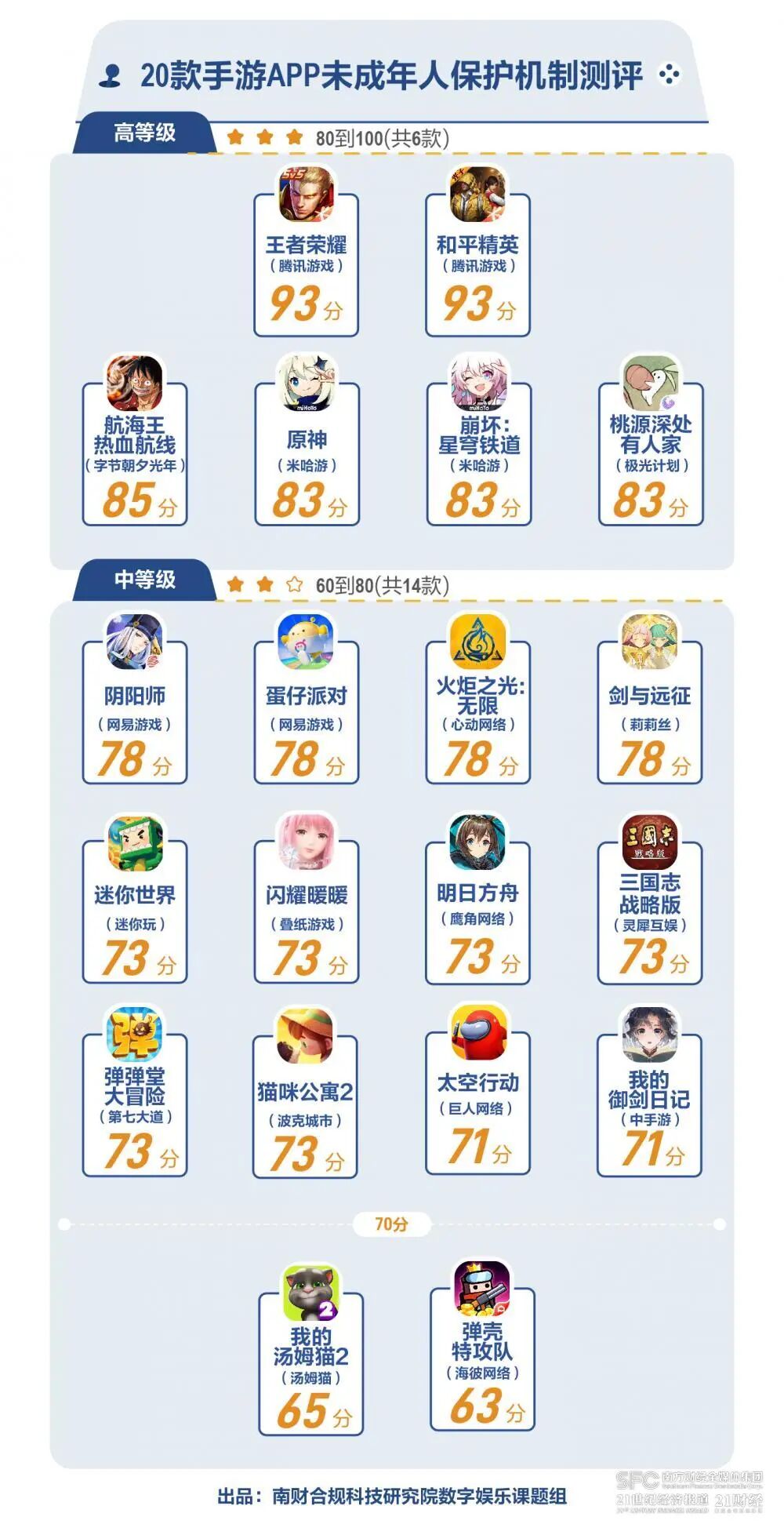 结果显示,20款手游的平均得分为77分,其中达到高等级(80分至100分)的游戏共有5款:《王者荣耀》(93分)《和平精英》(93分)《航海王热血航线》(85分)《原神》(83分)《崩坏:星穹铁道》(83分)。其余游戏均为位于中等级(60分至80分),无游戏不及格。