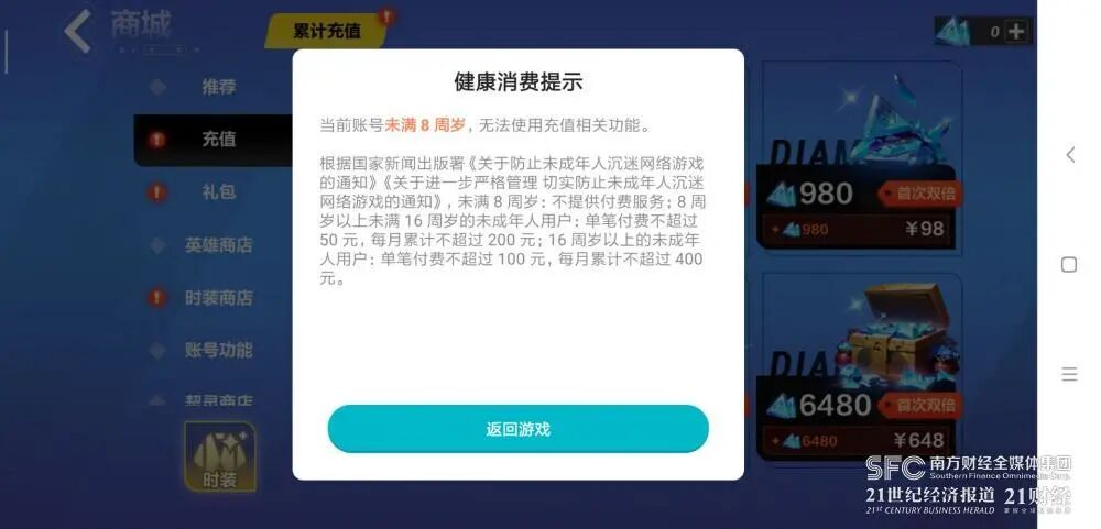 而充值限额则是预防未成年人在游玩中大额充值的一道必不可少的门槛。根据2019年国家新闻出版署印发《关于防止未成年人沉迷网络游戏的通知》中的相关规定,网络游戏企业不得为未满8周岁的用户提供游戏付费服务,8周岁以上未满16周岁的用户,单次充值金额不得超过50元人民币,每月充值金额累计不得超过200元人民币;16周岁以上未满18周岁的用户,单次充值金额不得超过100元人民币,每月充值金额累计不得超过400元人民币。